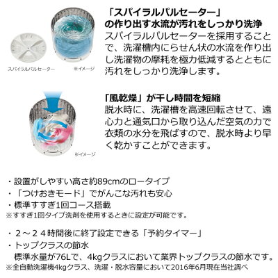 ◆ 主な特長 ◆◆ 主な仕様 ◆容量(洗濯/風乾燥)4.5Kg/2Kg標準使用水量76L運転目安時間標準コース37分/お急ぎコース10分消費電力(50/60Hz)215/285W外形寸法幅526×奥行500×高さ888mm(給・排水ホース含む)ボディ幅500mm以上質量25.2kg