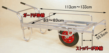 ∞∞商品のご案内∞∞ ○メーカー名 ハラックス株式会社 ○商品名 アルミコンテナカー CN-65DS サイドガード付(伸縮) ストッパー伸縮タイプ ○仕様 エアータイヤ ○全幅(ガード幅) (cm) 53.5(63〜83) ○有効荷台長 (cm) 113〜133 ○本体重量(kg) 7.9 写真はCN-65DS(エアタイヤ・ブレーキ無し)です。