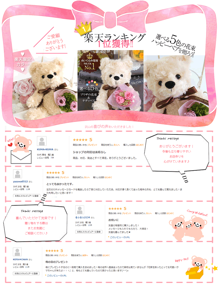 テディベアが再入荷しました!! クマちゃんが届けてくれるブーケは全部で5色。